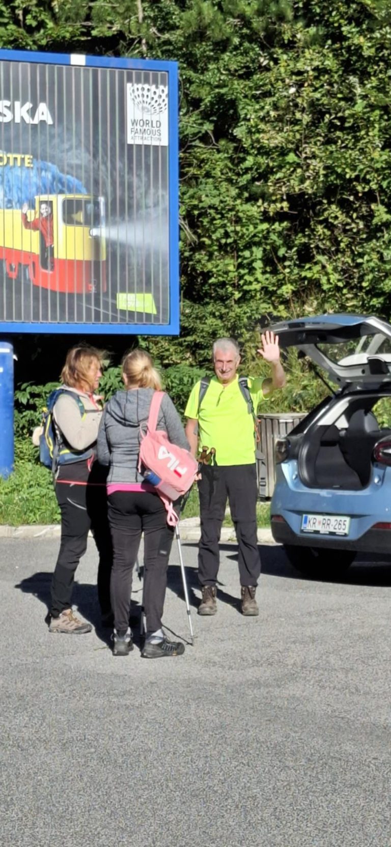 Zbrali smo se parkirišču pred predorom, vreme je bilo kot naročeno, dobra volja kot vedno, še toliko bolj ob spominskem darilu občine Tržič. Še malce bolj veseli smo bili, ko smo na klopci ob vodnjaku srečali našega člana Janeza s partnerko. Tega sploh nismo pričakovali, zato smo bili srečanja še toliko bolj veseli.